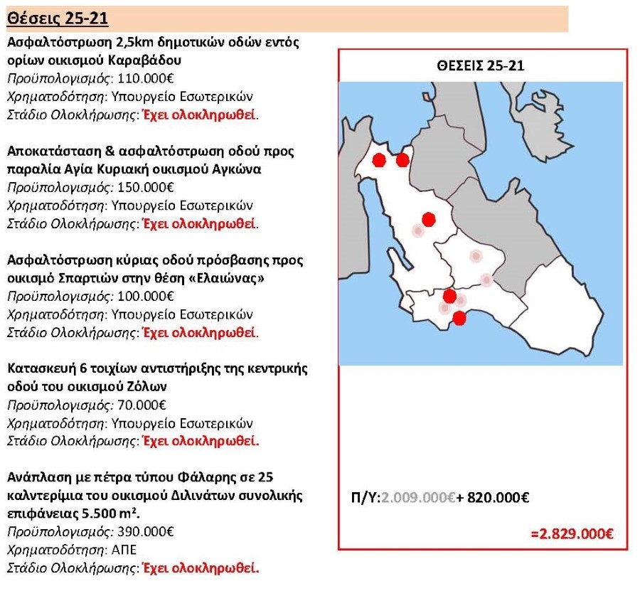 Για να μην γίνω ιδιαίτερα κουραστικός, παραθέτω μόνο 30 έργα. Έχουν ταξινομηθεί σε ομάδες των πέντε (5) για να είναι πιο εύληπτα από το μυαλό. Όλα αφορούν σε παρεμβάσεις σε περιοχές ΕΚΤΟΣ της πόλης του Αργοστολίου.