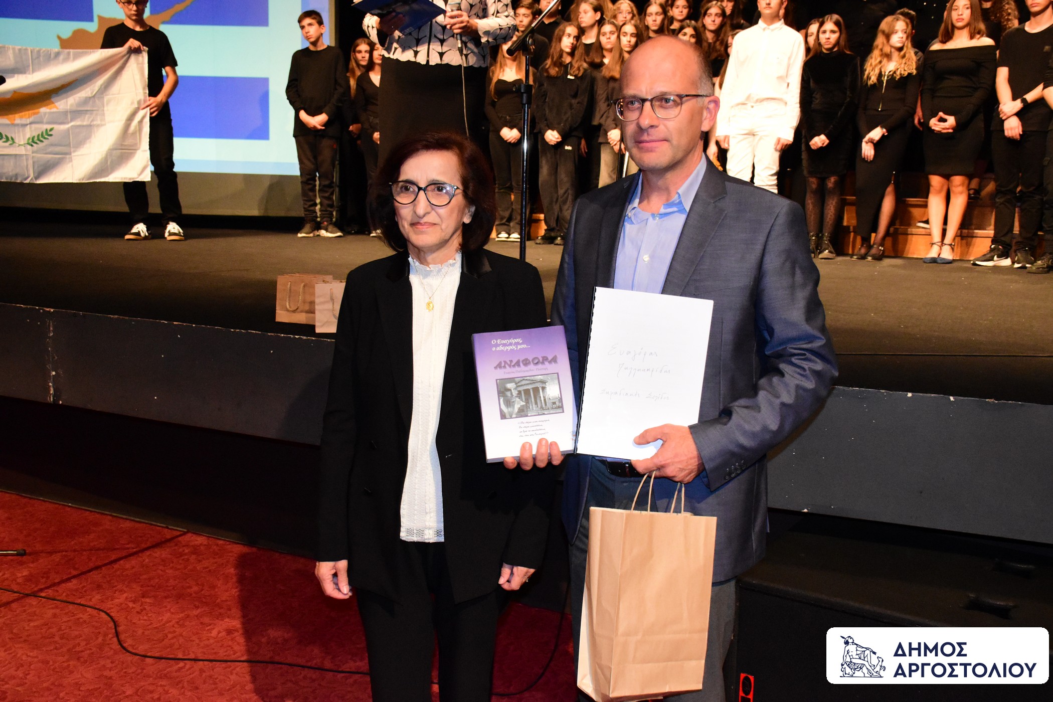 Ο Δήμος Αργοστολίου, τίμησε με αναμνηστικά δώρα, τον μακαριώτατο Αρχιεπίσκοπο Πάσης Κύπρου και Νέας Ιουστινιανής, κ.κ. Γεώργιος, τον Δημοτικό Σύμβουλο Δήμου Πάφου και Αντιπρόεδρο του Πολιτιστικού Συλλόγου ‘’Ευαγόρας Παλληκαρίδης’’ κ. Γιώργο Πίτρο, καθώς και τον συναγωνιστή του Ευαγόρα Παλληκαρίδη, κ. Γιώργο Στενιώτη.