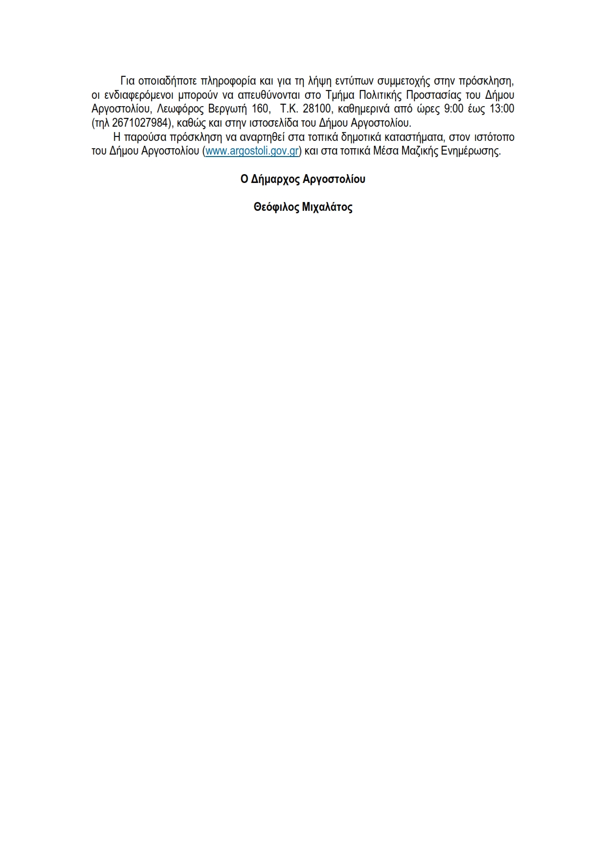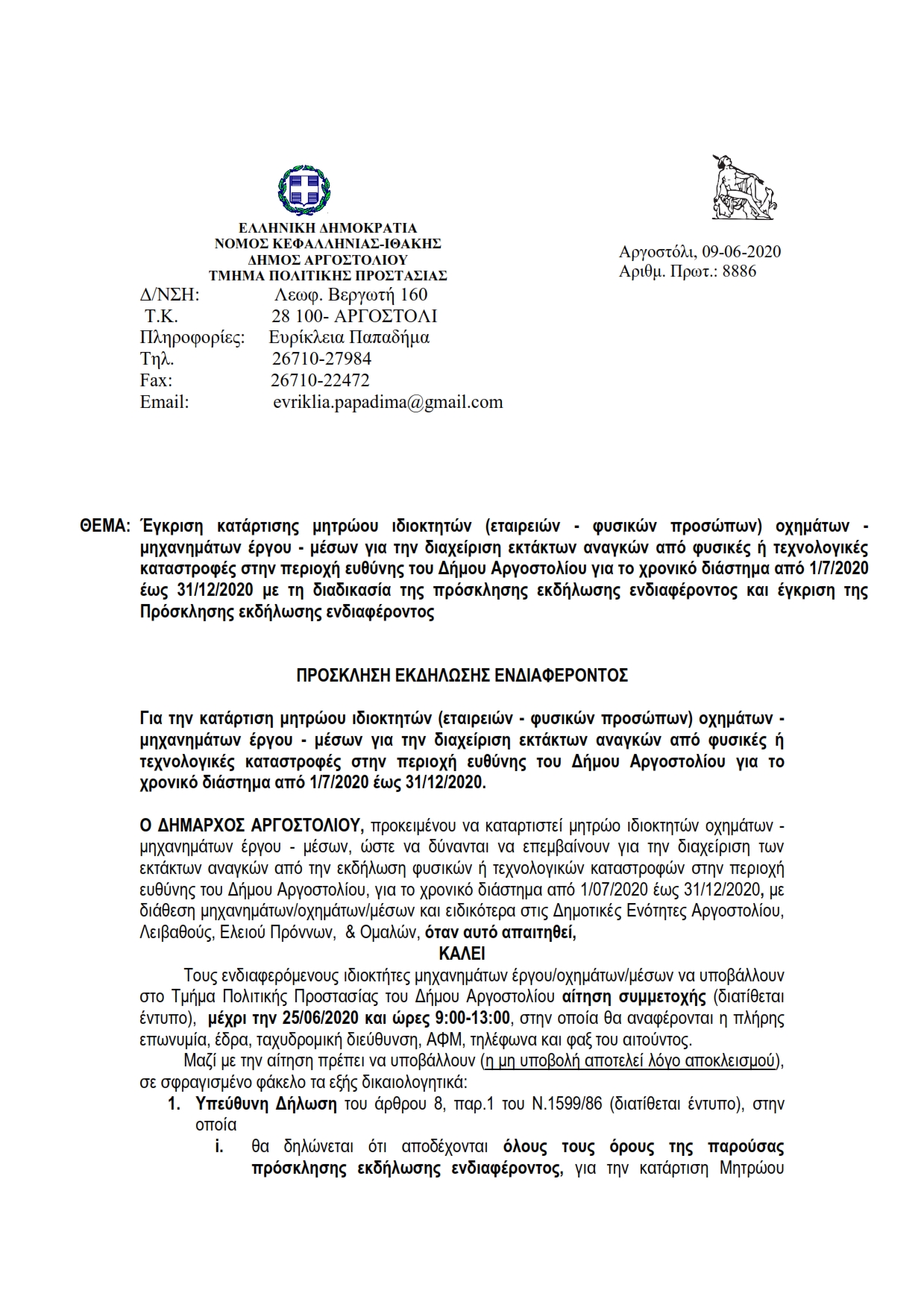 Έγκριση κατάρτισης μητρώου ιδιοκτητών (εταιρειών – φυσικών προσώπων) οχημάτων – μηχανημάτων έργου – μέσων για την διαχείριση εκτάκτων αναγκών από φυσικές ή τεχνολογικές καταστροφές στην περιοχή ευθύνης του Δήμου Αργοστολίου για το χρονικό διάστημα από 1/7/2020 έως 31/12/2020 με τη διαδικασία της πρόσκλησης εκδήλωσης ενδιαφέροντος και έγκριση της Πρόσκλησης εκδήλωσης ενδιαφέροντος