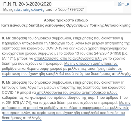 1. Οι επιχειρήσεις που -λόγω των μέτρων- δεν κάνουν χρήση παραχωρημένου κοινόχρηστου χώρου να απαλλάσσονται από τα αναλογούντα τέλη.