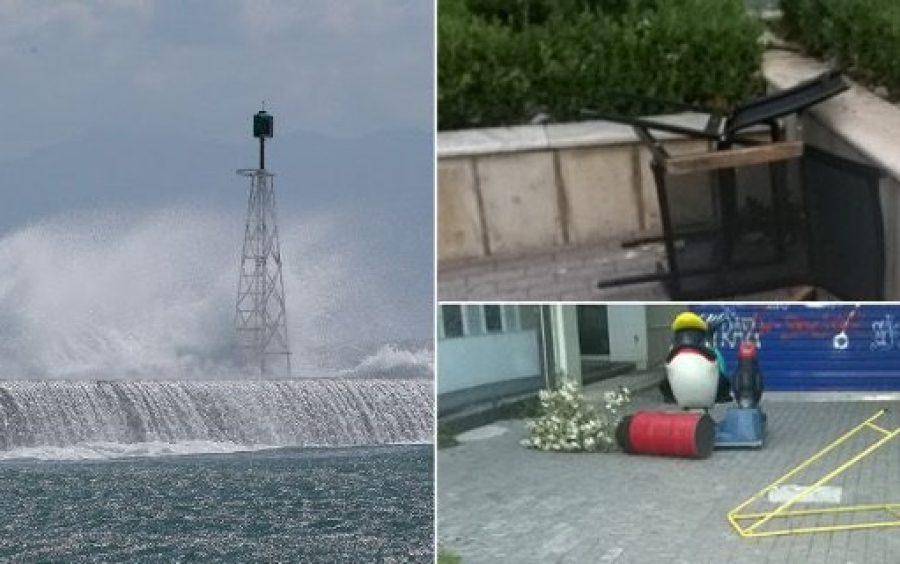Στην παραλία της πόλης ήρθαν κυριολεκτικά τα... πάνω κάτω, αφού ο δυνατός αέρας παρέσυρε πινακίδες, καρέκλες, κάδους κ.λπ., ενώ τα κύματα στη θάλασσα ήταν μανιασμένα.