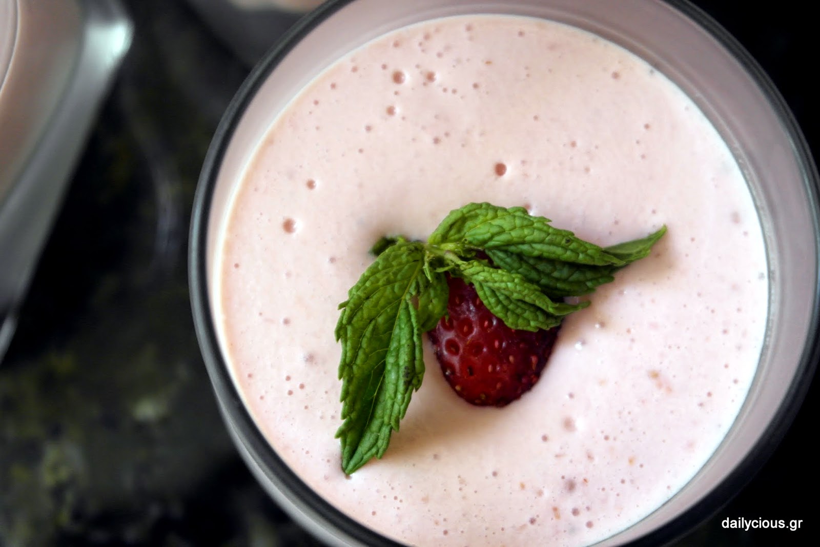Μοιράζω το μείγμα σε 5-6 ποτηράκια ή μπολάκια και τοποθετώ από μία φράουλα και 2-3 φιλαράκια δυόσμου σε κάθε ποτήρι.
