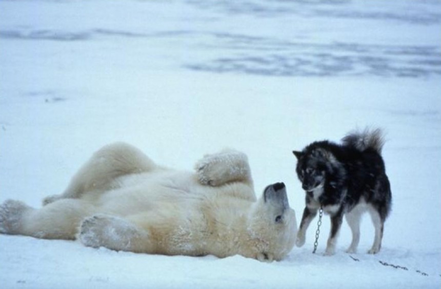 Ο φωτογράφος της άγριας φύσης Norbert Rosing βρέθηκε για επαγγελματικούς λόγους κοντά στο Churchill στη Μανιτόμπα, όταν έκπληκτος αντίκρισε ένα παράδοξο… φαινόμενο, το οποίο βέβαια απαθανάτισε με τη φωτογραφική του: Μια πολική αρκούδα και ένα χάσκι… χαριεντίζονται στο χιόνι!
