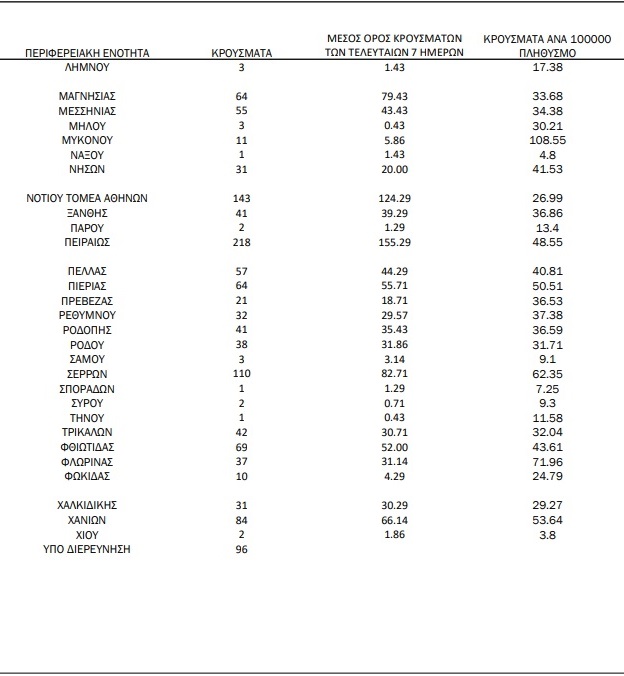 - Με βάση τα επιβεβαιωμένα κρούσματα των τελευταίων 7 ημερών, 151 θεωρούνται σχετιζόμενα με ταξίδι από το εξωτερικό και 3.116 είναι σχετιζόμενα με ήδη γνωστό κρούσμα