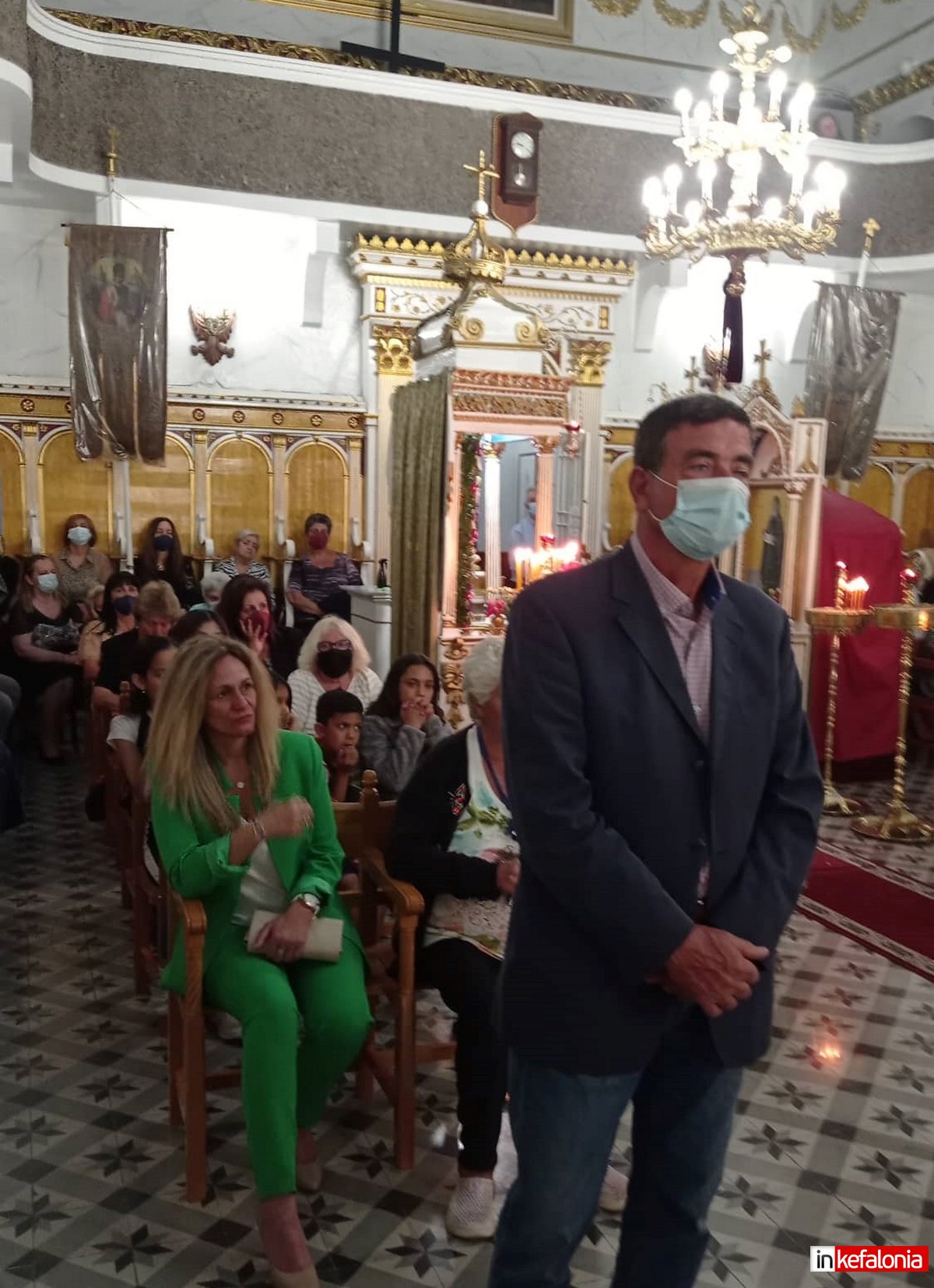 Πλήθος ιερέων και πιστών συμμετείχαν στον Εσπερινό, παρουσία του Δημάρχου Αργοστολίου Θεόφιλου Μιχαλάτου και της προέδρου της Τοπικής Κοινότητας Ειρήνης Σταματελάτου.