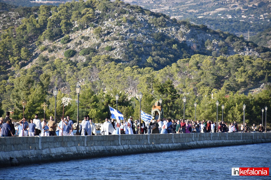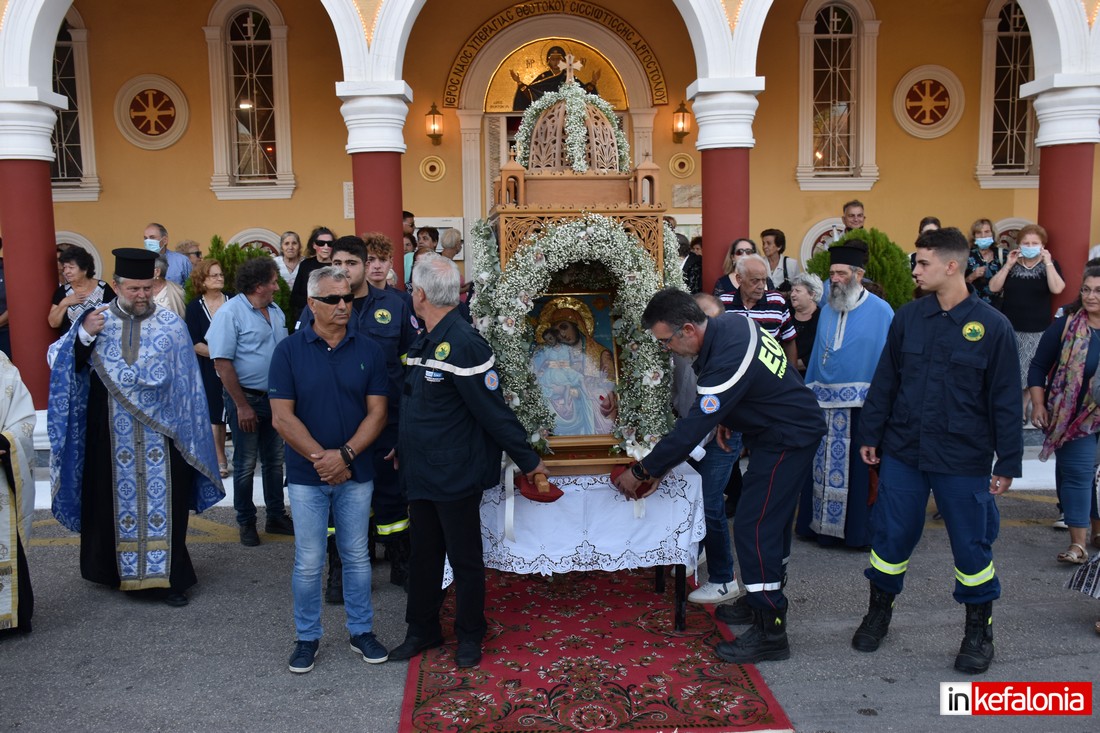 Τον θρόνο με την εικόνα της Παναγίας σήκωσαν τα μέλη της ΕΟΔ Κεφαλονιάς και συνόδευσαν, η φιλαρμονική Δήμου Αργοστολίου "Διονύσιος Λαυράγκας", το Λύκειο Ελληνίδων Παράρτημα Αργοστολίου και οι αθλητές του ΝΟΑ! Το παρών στην λιτανεία έδωσαν ο δήμαρχος Αργοστολίου Θεόφιλος Μιχαλάτος, ο αντιπεριφερειάρχης Κεφαλονιάς και Ιθάκης Σταύρος Τραυλός, ο πρόεδρος του Δημοτικού Συμβουλίου Αργοστολίου Νικόλας Βαλλιανάτος, οι αντιδήμαρχοι Σπύρος Σαμούρης και Σπύρος Πεφάνης, ο δημοτικος σύμβουλος Διονύσης Πολλάτος, οι περιφερειακοί σύμβουλοι Σωτήρης Κουρής και Δημήτρης Σπανός, καθώς και ο πρόεδρος της τοπικής Κοινότητας Αργοστολίου Θόδωρος Αλυσανδράτος, μαζί με μέλη του ΔΣ της Κοινότητας, ο σύμβουλος δημάρχου σε θέματα πολιτισμού Διονύσης Φωκάς, εκπρόσωποι των Σωμάτων Ασφαλείας της Κεφαλονιάς, o εφημέριος της Καθολικής Εκκλησίας του Αργοστολίου π. Σιμονέλ Μποάνκις .