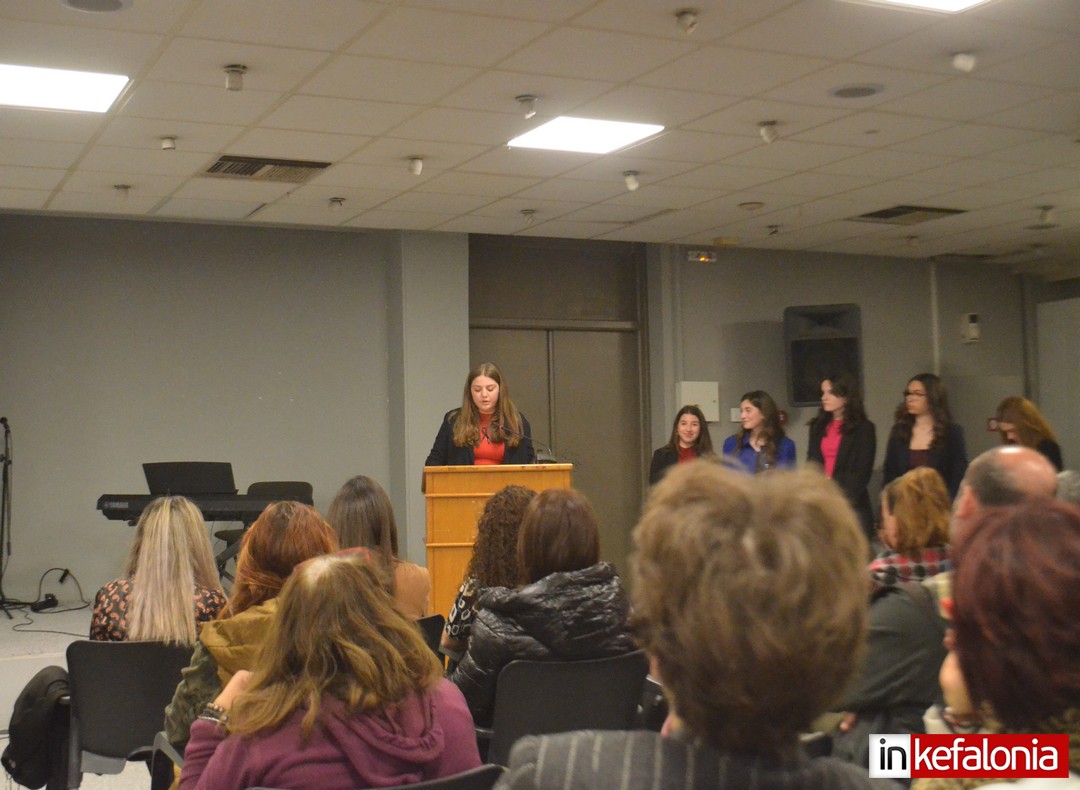 Κεντρικές ομιλήτριες της βραδιάς ήταν μαθήτριες από το δεύτερο Γυμνάσιο Αργοστολίου και από το Λύκειο Κεραμειών Χριστιάννα Βουτσινά, Μαρίνα Ασβεστά, Ευτυχία Ζαφειράτου, Γεωργία Καλογηράτου, Ναταλία Παπαγιάννη, Βιβιάννα Φίζη και Νίκη Μεσολωρά. Τα νεαρά κορίτσια εξέφρασαν τις απόψεις τους για τη θέση που πρέπει να κατέχει η γυναίκα στην σύγχρονη εποχή. Θέση σε μια κοινωνία, χωρίς φόβο, χωρίς έκφυλη βία, με ίσες ευκαιρίες, δικαιώματα και εργασιακές ευκαιρίες.