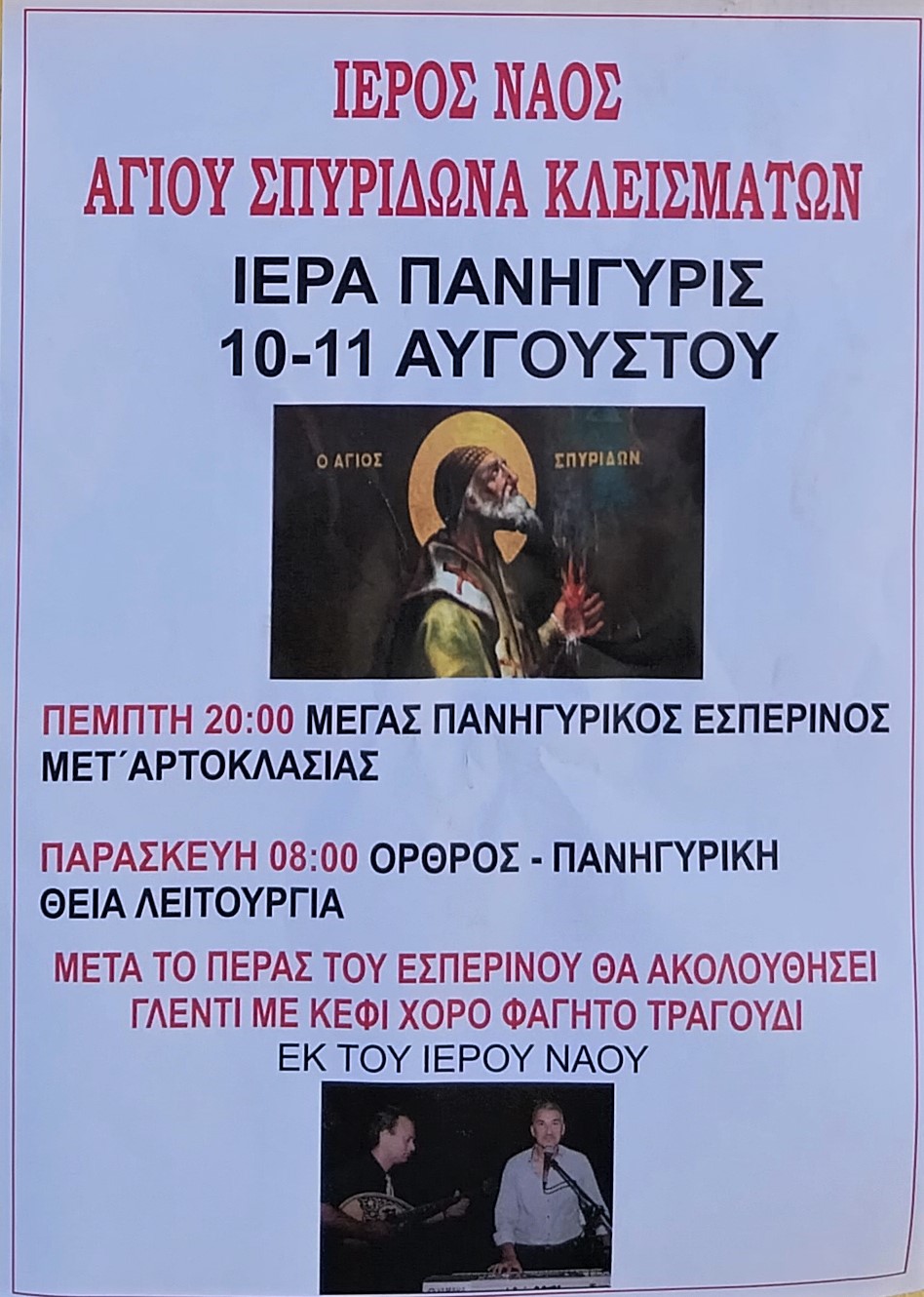 Το πανηγύρι του Αγίου Σπυρίδωνα στα Κλείσματα την Πέμπτη 10 - 11 Αυγούστου.