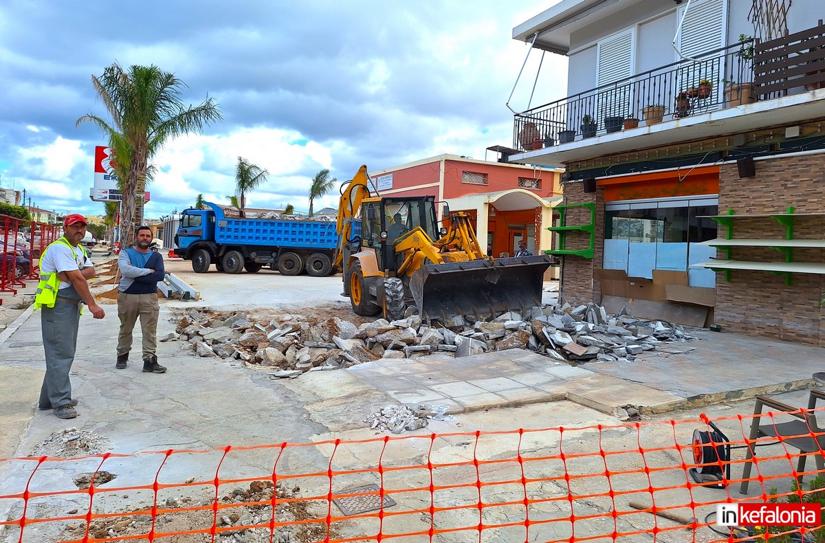 Στο σημείο που βρισκόταν η πέργκολα, σήμερα μπήκαν τα μηχανήματα JCB και ήδη ‘’σπάνε’’ τις παλιές πλάκες, ώστε να προχωρήσει η ανάπλαση που θα αναβαθμίσει το σημαντικό αυτό σημείο της παραλίας του Αργοστολίου.