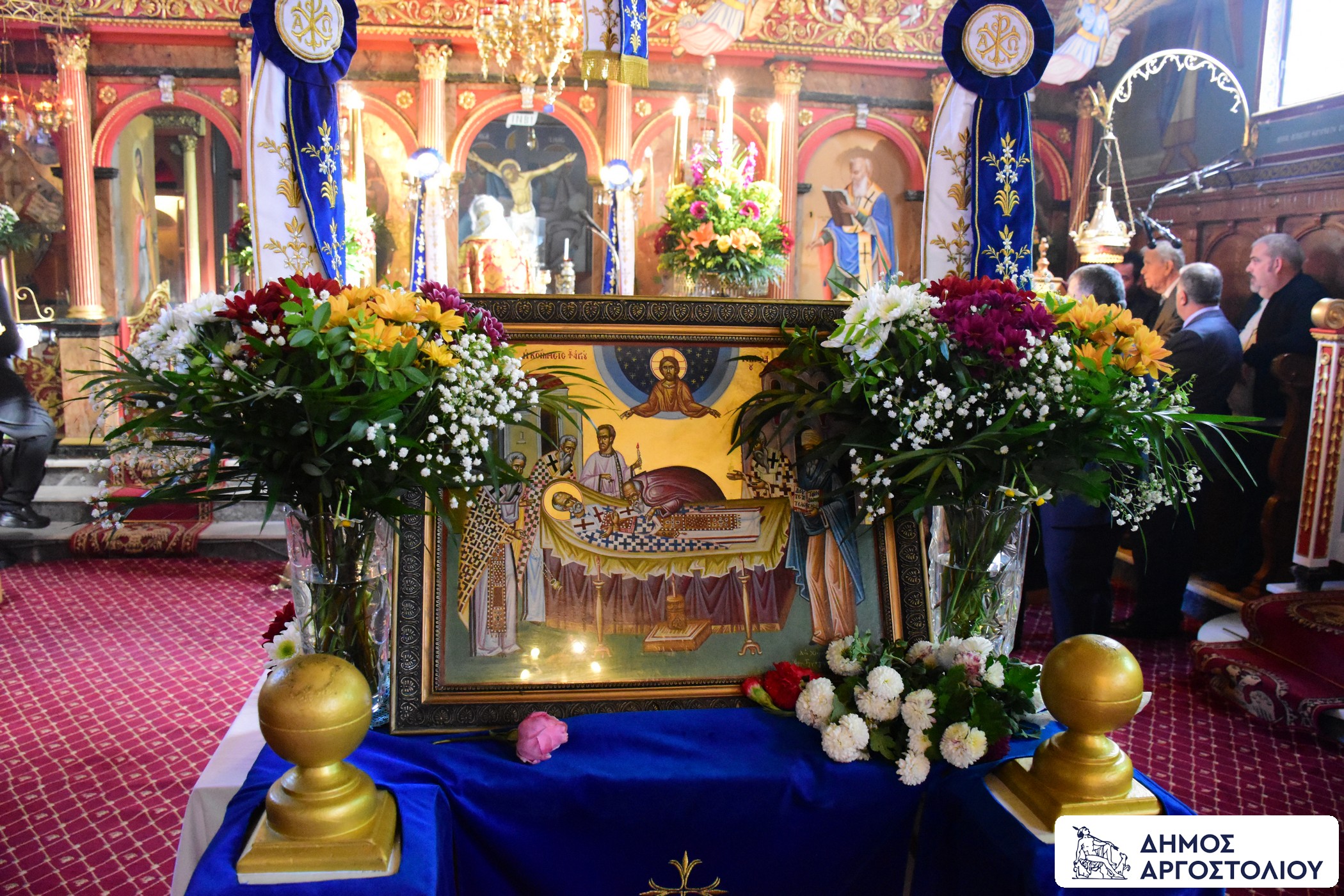 Στην πανηγυρική Θεία Λειτουργία χοροστάτησε ο σεβασμιότατος Μητροπολίτης Κεφαλληνίας Δημήτριος, ενώ το παρών έδωσαν, οι Αντιπεριφερειάρχες Σωτήρης Κουρής και Ελένη Παπαναστασάτου, εκπρόσωποι των σωμάτων Ασφαλείας, ο Διοικητής και σπουδαστές της ΑΕΝ και πλήθος πιστών. Ακολούθησε κέρασμα.