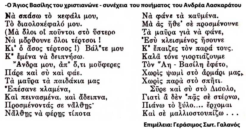 Ο Ανδρέας Λασκαράτος μας σκιαγραφεί σατιρικά ποιητικά τη λαογραφική εικόνα μιας εποχής, υμνώντας τη μεγάλη προσωπικότητα του Ορθοδόξου Αγίου και αυτό που συνέβαινε κατά τον 19ον αιώνα στην Κεφαλονιά με την άκρατη χαρτοπαιξία και τα κοινωνικά και οικογενειακά προβλήματα, που αυτή δημιουργούσε. Βέβαια, υπάρχει και δεύτερη ποιητική σατιρική έκφραση του Λασκαράτου για τον άγιο Βασίλη με τίτλο «Ο Αης –Βασίλης του χριστιανώνε» που και σ’ αυτήν «ζωγραφίζει» καλύτερα τη χαρτοπαιξία και το πρόβλημα που δημιουργεί σε μια οικογένεια. Ας μείνουμε όμως στο πρώτο, ποίημα με τίτλο «Βασίλη , πως σ’ εκάμανε» που δείχνει τη βαθιά εσωτερική καθαρή πίστη του Λασκαράτου απέναντι στη χριστιανική θρησκεία. Στις δυο εικόνες του άρθρου είναι το άλλο ποίημα του Λασκαράτου «Ο Αης –Βασίλης του χριστιανώνε».