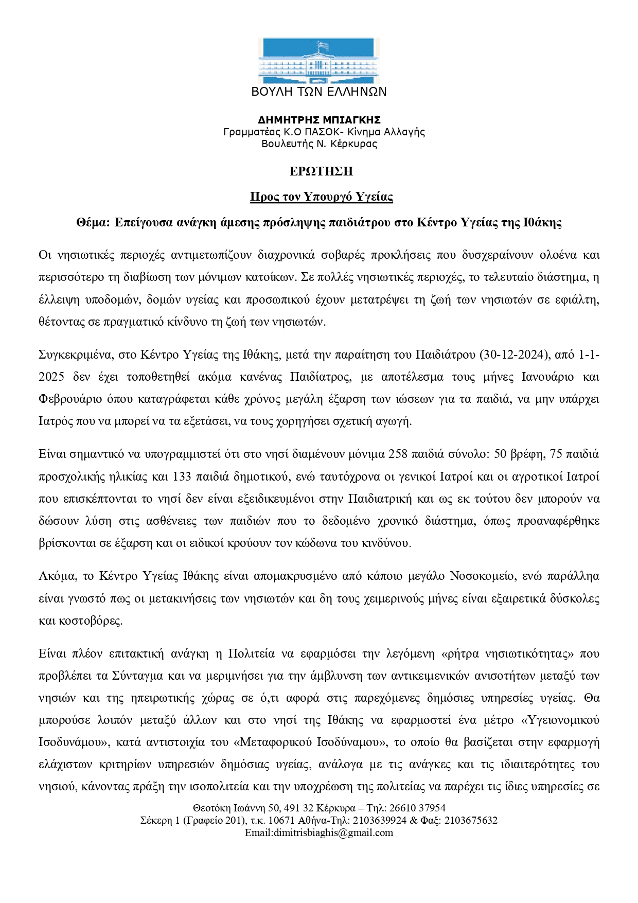 Κατατέθηκε σήμερα στη Βουλή των Ελλήνων, η υπ’ αριθμ. 3207/10-2-2025 Ερώτηση του Δημητρίου Μπιάγκη, Γραμματέα της Κοινοβουλευτικής Ομάδας του ΠΑ.ΣΟ.Κ. – Κινήματος Αλλαγής & Βουλευτή Κέρκυρας, την οποία συνυπογράφουν οι Βουλευτές: Παύλος Γερουλάνος (Α’ Αθηνών), Δημήτρης Μάντζος (Επικρατείας) και Ιωάννης Τσίμαρης (Ιωαννίνων) με θέμα την επείγουσα ανάγκη άμεσης πρόσληψης παιδιάτρου στο Κέντρο Υγείας της Ιθάκης.