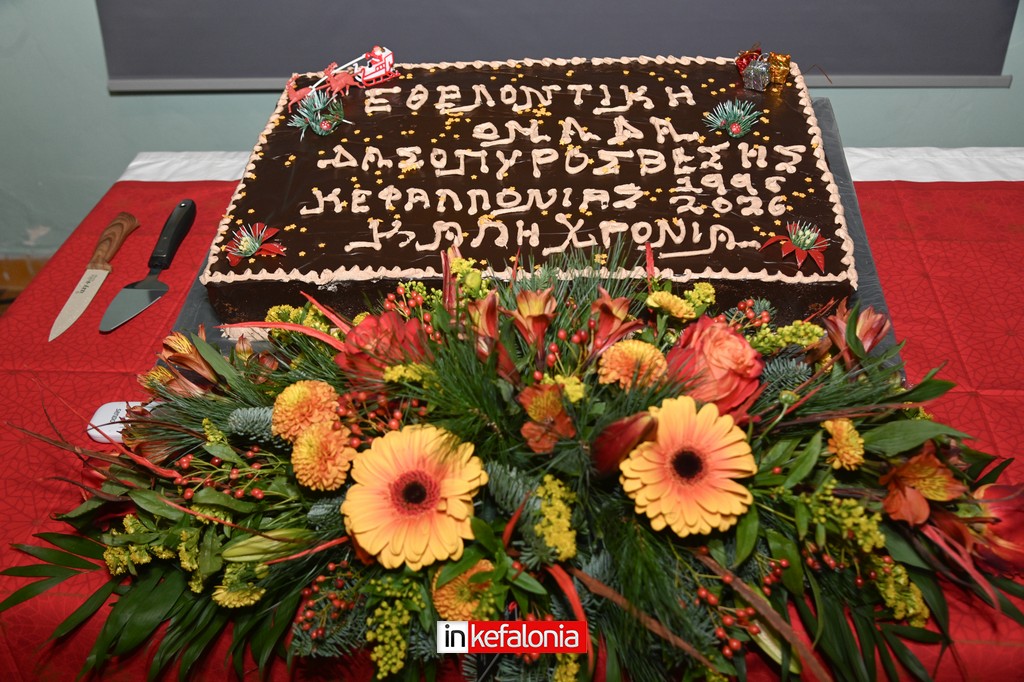 Την βασιλόπιτα ευλόγησε και έκοψε ο ιερέας π. Ανδρέας Σβορώνος, μαζί με τον επικεφαλής της Εθελοντικής Ομάδας Δασοπυρόσβεσης Κεφαλονιάς, Σπύρο Μοσχόπουλο.