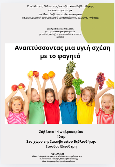 Ο Σύλλογος Φίλων της Ιακωβατείου Βιβλιοθήκης- Μουσείου, σας καλεί στην εκδήλωση για την Παιδική Παχυσαρκία, που διοργανώνει σε Συνεργασία με το Μαντζαβινάτειο Νοσοκομείο Ληξουρίου, το Σάββατο 14 Φεβρουαρίου 2026 και ώρα 10 π.μ.