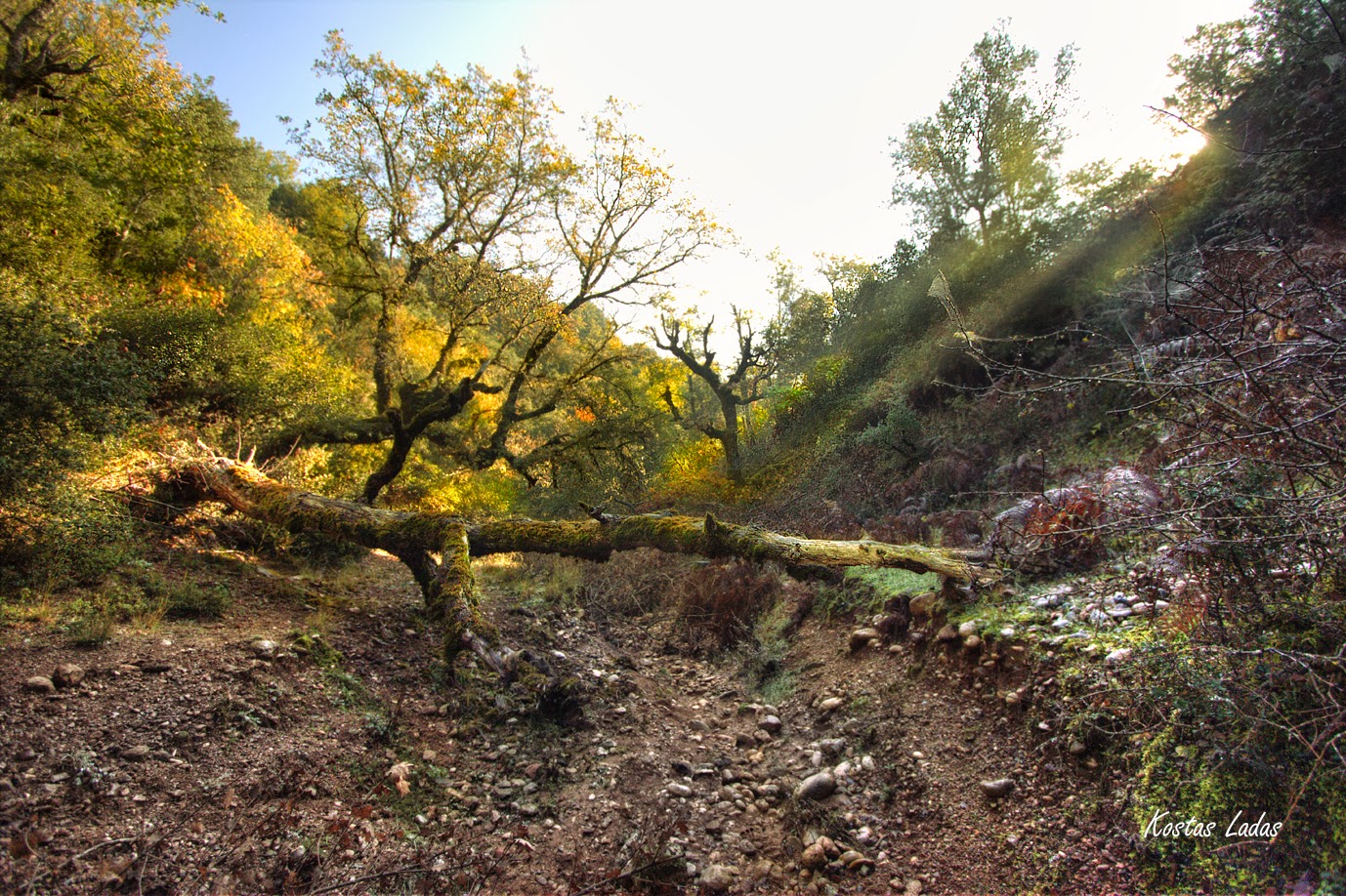 Αρχικά, συναντούμε ένα ελαφρώς κατηφορικό μονοπάτι περίπου 900 μέτρων. Είναι φαρδύ, πετρώδες και υπάρχει αρκετά μεγάλη ποικιλία στην βλάστηση, από φτέρες και βότανα μέχρι πουρνάρια και αριές. Οι φτέρες αγκαλιάζουν το μονοπάτι, οι θάμνοι τις πλαισιώνουν και πολύ λίγα μέτρα μακριά μας βρίσκεται το δρυοδάσος, που μας ξεπροβοδίζει και ορίζει την πορεία μας. Τις πρωινές ώρες ο επισκέπτης πρέπει να έχει το νου του για τα παιχνίδια του φωτός πίσω από την πλάτη του. Αξίζει να σταματήσει αρκετές φορές για να θαυμάσει τον τρόπο που οι ακτίνες του ηλίου προσπαθούν να τον αγγίξουν.
