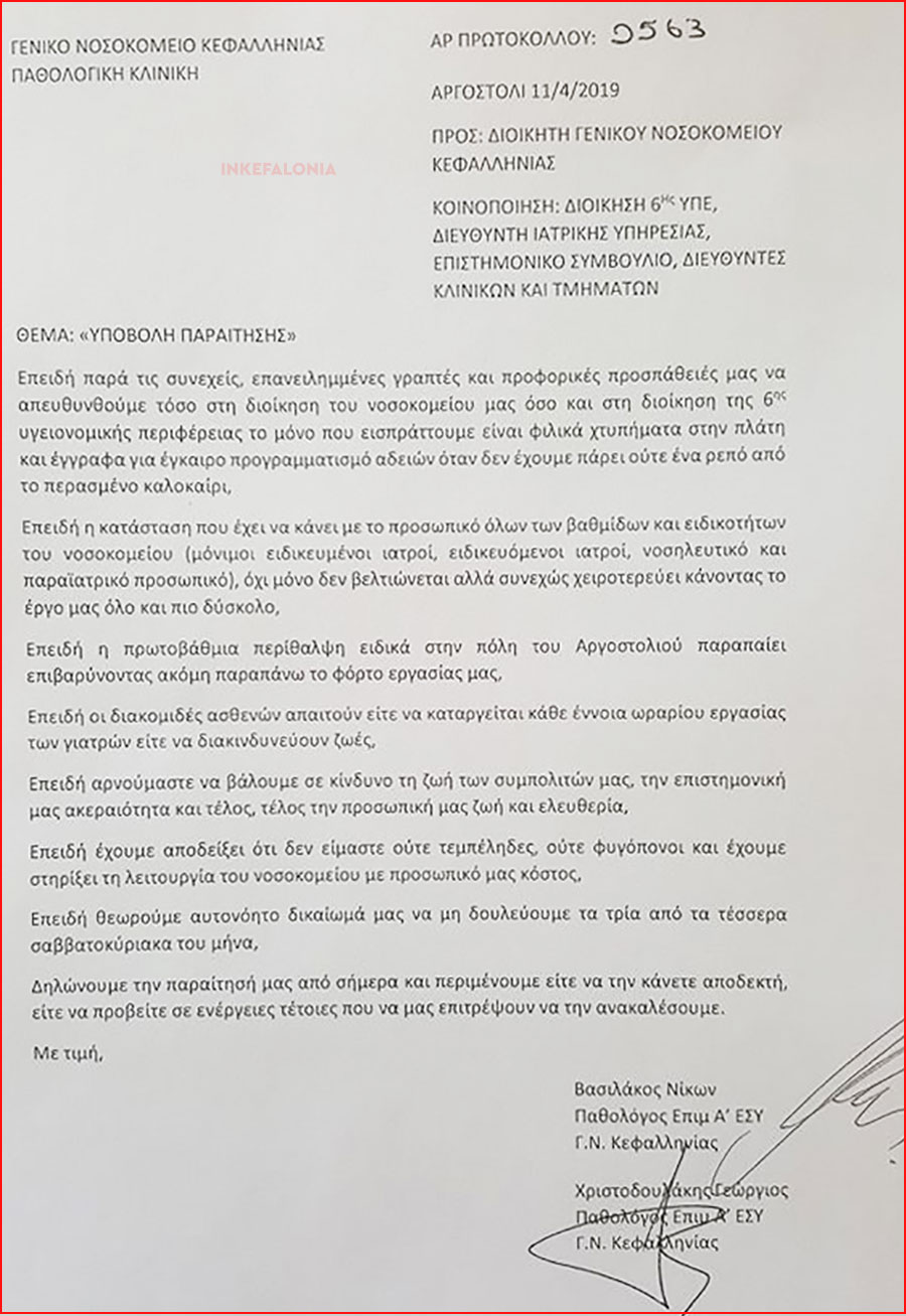 Το INKEFALONIA.GR , επιδιώκοντας να κρατήσει το θέμα ψηλά στην επικαιρότητα, καθώς είναι ιδιαιτέρως σοβαρό, αναδεικνύει σήμερα την επιστολή παραίτησης των δυο Παθολόγων κ. Βασιλάκου και Χριστοδουλάκη, η οποία εστάλη την περασμένη Πέμπτη στον κ. Βιβλάκη , την 6η ΥΠΕ,
