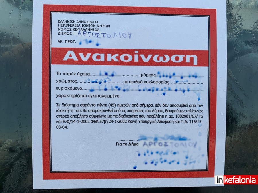 Συνεχίζεται το πρόγραμμα καταγραφής και απομάκρυνσης των εγκαταλελειμμένων αυτοκινήτων από τους δρόμους του Αργοστολίου.