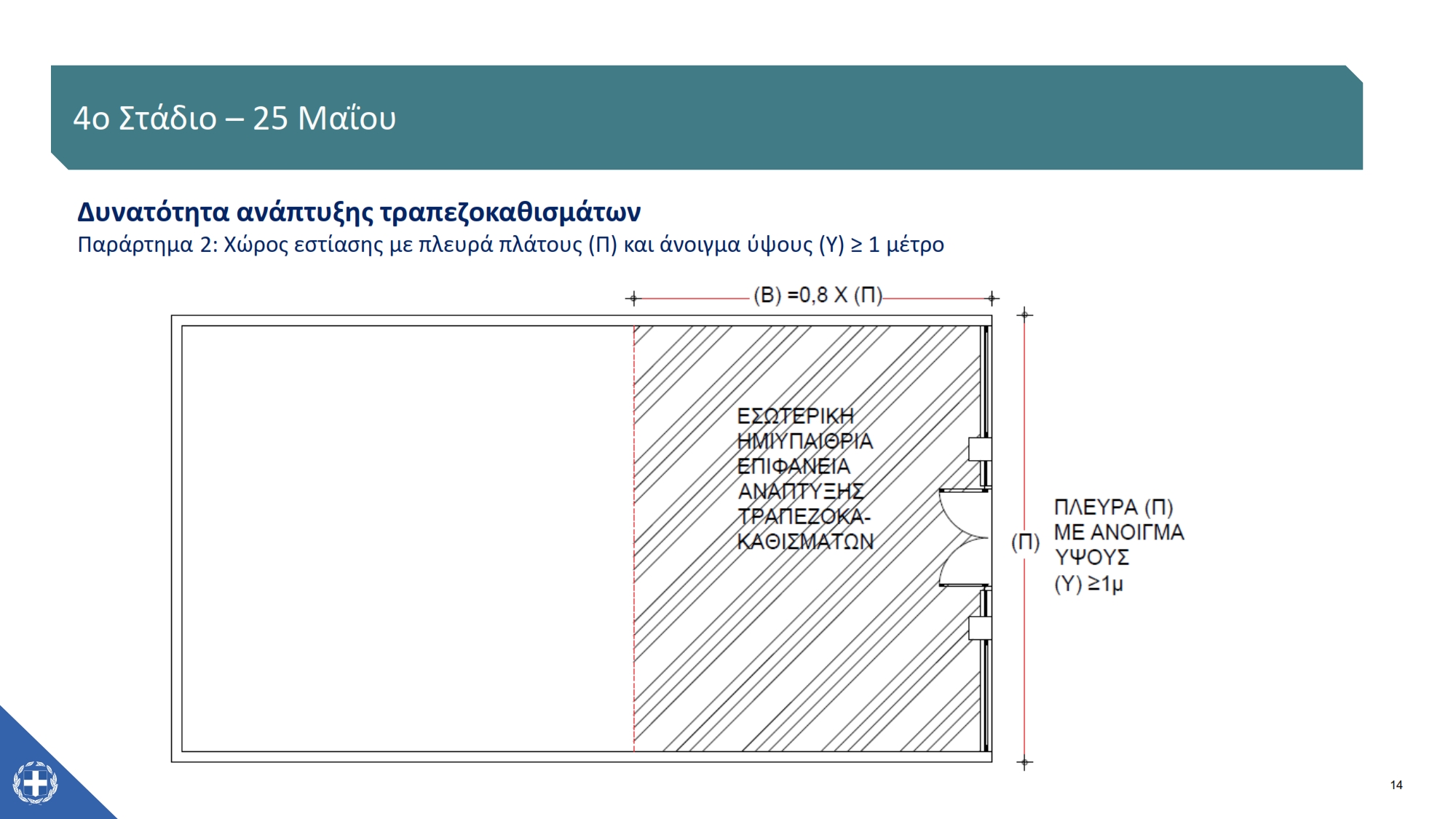 Η υπαίθρια επιφάνεια είναι το εμβαδόν της επιφάνειας εκτός του φυσικού καταστήματος ενώ η εσωτερική ημιυπαίθρια επιφάνεια είναι η επιφάνεια εντός του καταστήματος που δύναται να αναπτυχθούν τραπεζοκαθίσματα.