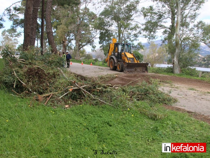 Συνεργεία του Δήμου Αργοστολίου, συνεχίζουν και σήμερα τις κοπές, καθώς τα κλαδιά αυτά είναι επικίνδυνα.