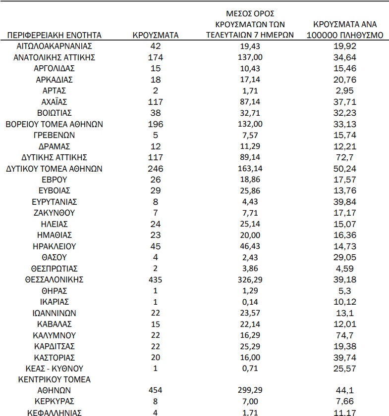 Οι νέοι θάνατοι ασθενών με COVID-19 είναι 73, ενώ από την έναρξη της επιδημίας έχουν καταγραφεί συνολικά 8.680 θάνατοι. Το 95.6% είχε υποκείμενο νόσημα ή/και ηλικία 70 ετών και άνω.