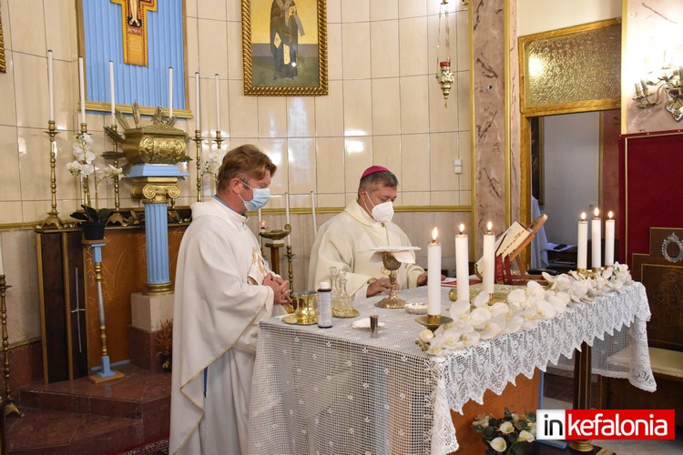 Τελέστηκε, επίσημη Αρχιερατική Θεία Λειτουργία στην οποία χοροστάτησε ο Σεβ. Καθολικός Αρχιεπίσκοπος Κερκύρας, Κεφαλληνίας και Ζακύνθου,π. Γεώργιος Αλτουβάς, μαζί με τον εφημέριο του Ναού π. Σιμονέλ Μποάνκις.