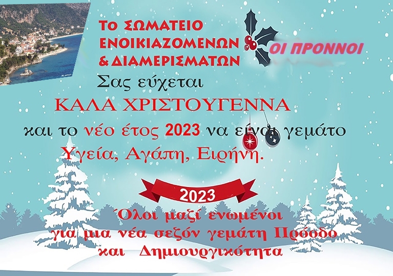 Το Σωματείο Ενοικιαζομένων Δωματίων & Διαμερισμάτων ΟΙ ΠΡΟΝΝΟΙ εύχεται υγεία, αγάπη, δημιουργικότητα .