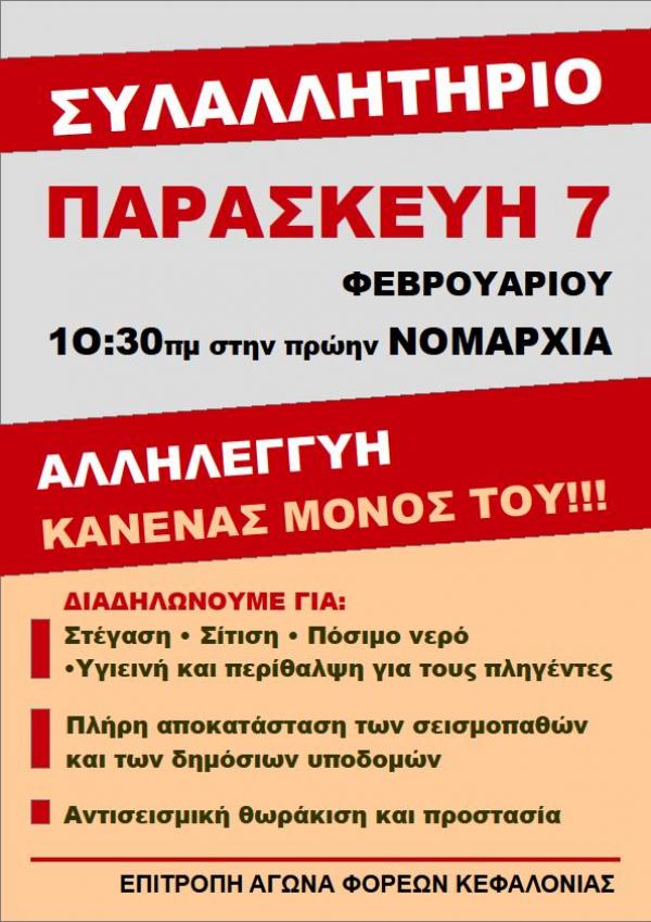 Συμμετέχουμε όλοι στην 4ωρη στάση εργασίας την Παρασκευή 7/2/2014 από τις 09:00 έως τις 13:00 και στο συλλαλητήριο στις 10:30 π.μ. στην πρώην Νομαρχία που διοργανώνει η επιτροπή αγώνα φορέων της Κεφαλονιάς.