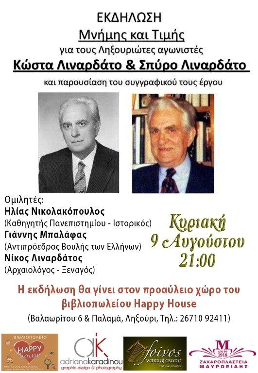 Εκδήλωση μνήμης & τιμής για τους Ληξουριώτες αγωνιστές Κώστα & Σπύρο Λιναρδάτο, την Κυριακή 9 Αυγούστου στις 21.00 στον προαύλιο χώρο του βιβλιοπωλείου "Happy House" στο Ληξούρι.