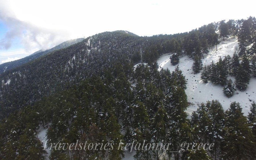 Βρισκόμαστε στα 1000μ. υψόμετρο, 628μ. από την κορυφή του φρεσκοχιονισμένο και κατάλευκου Αίνου, του ψηλότερου βουνού των Ιονίων Νήσων που αποτελεί εθνικό δρυμό από το 1962, προστατευόμενο βιότοπο του δικτύου Natura 2000 και καλύπτεται κατά τα 2/3 του απ'το μοναδικό στον κόσμο είδος ελάτου, την Κεφαλληνιακή Ελάτη.