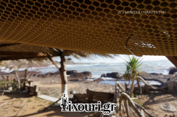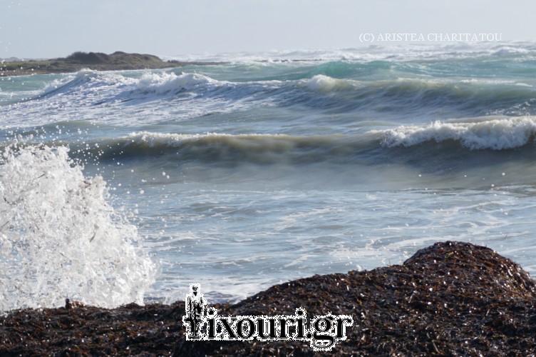 Η παραλία με την καστανοκόκκινη αμμουσιά, έως πέρα το Βραχυνάρι (Ακρωτήρι) κατά μήκος της βραχώδης ακτής, είχε καλυφθεί με πολλά στρώματα από φύκια και η εικόνα την στιγμή που έσκαγαν τα κύματα απλώς είναι μαγευτική.