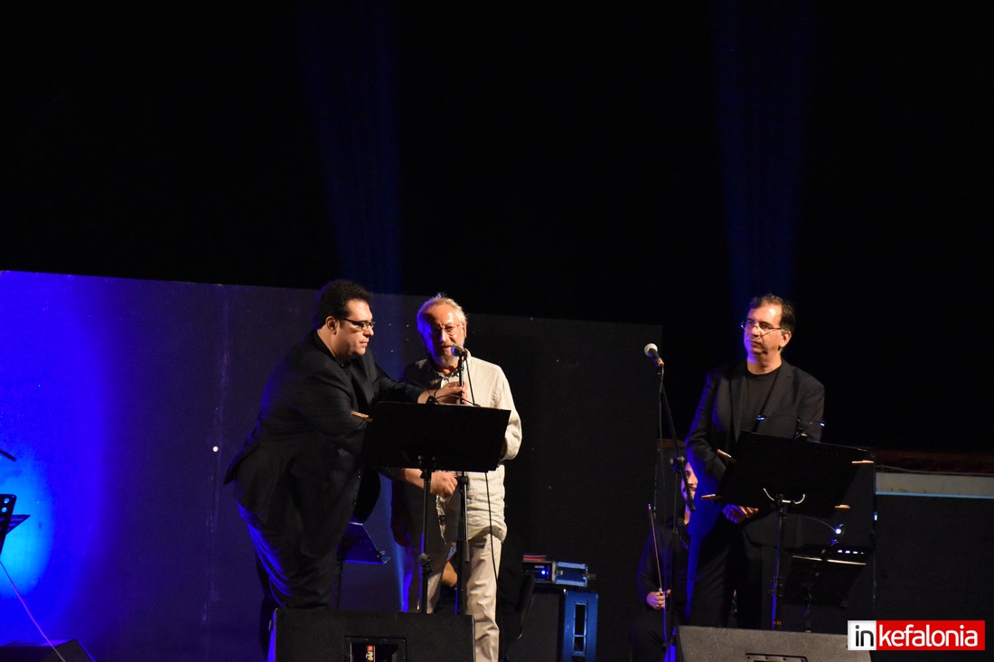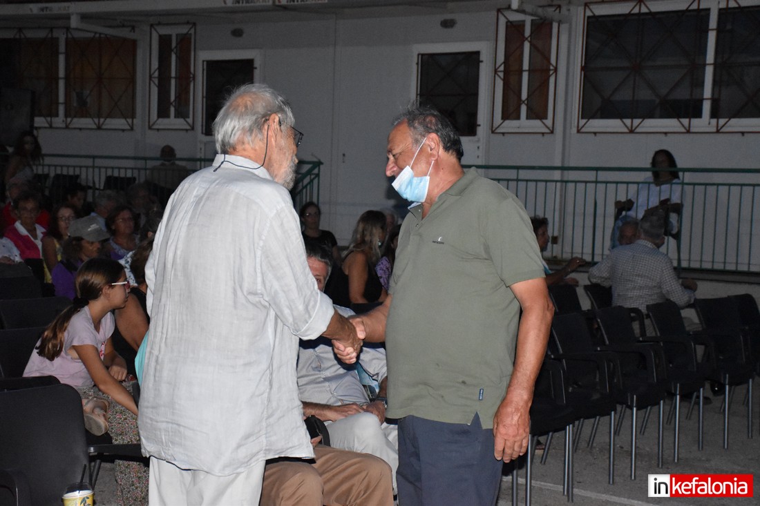 Ο σπουδαίος στιχουργός, εμφανώς συγκινημένος, ανέβηκε στην σκηνή και παρέλαβε από τον Αντιδήμαρχο Δήμου Αργοστολίου Γιώργο Τσιλιμιδό και τον Αντιπεριφερειάρχη Κεφαλονιάς και Ιθάκης Σταύρο Τραυλό τιμητικά δώρα.