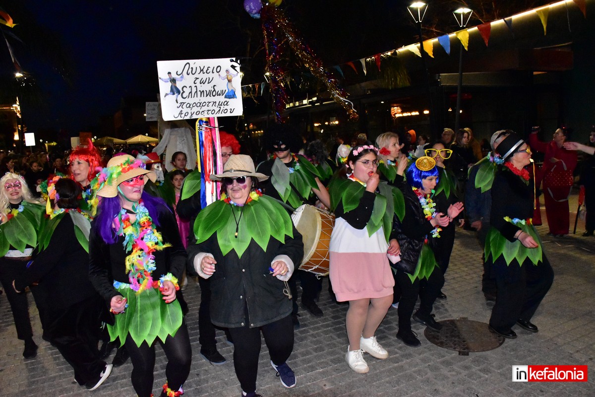 Ξέφρενο καρναβαλικό ξεφάντωμα, με Βραζιλιάνικο χρώμα στην βραδινή καρναβαλική παρέλαση στο Αργοστόλι.