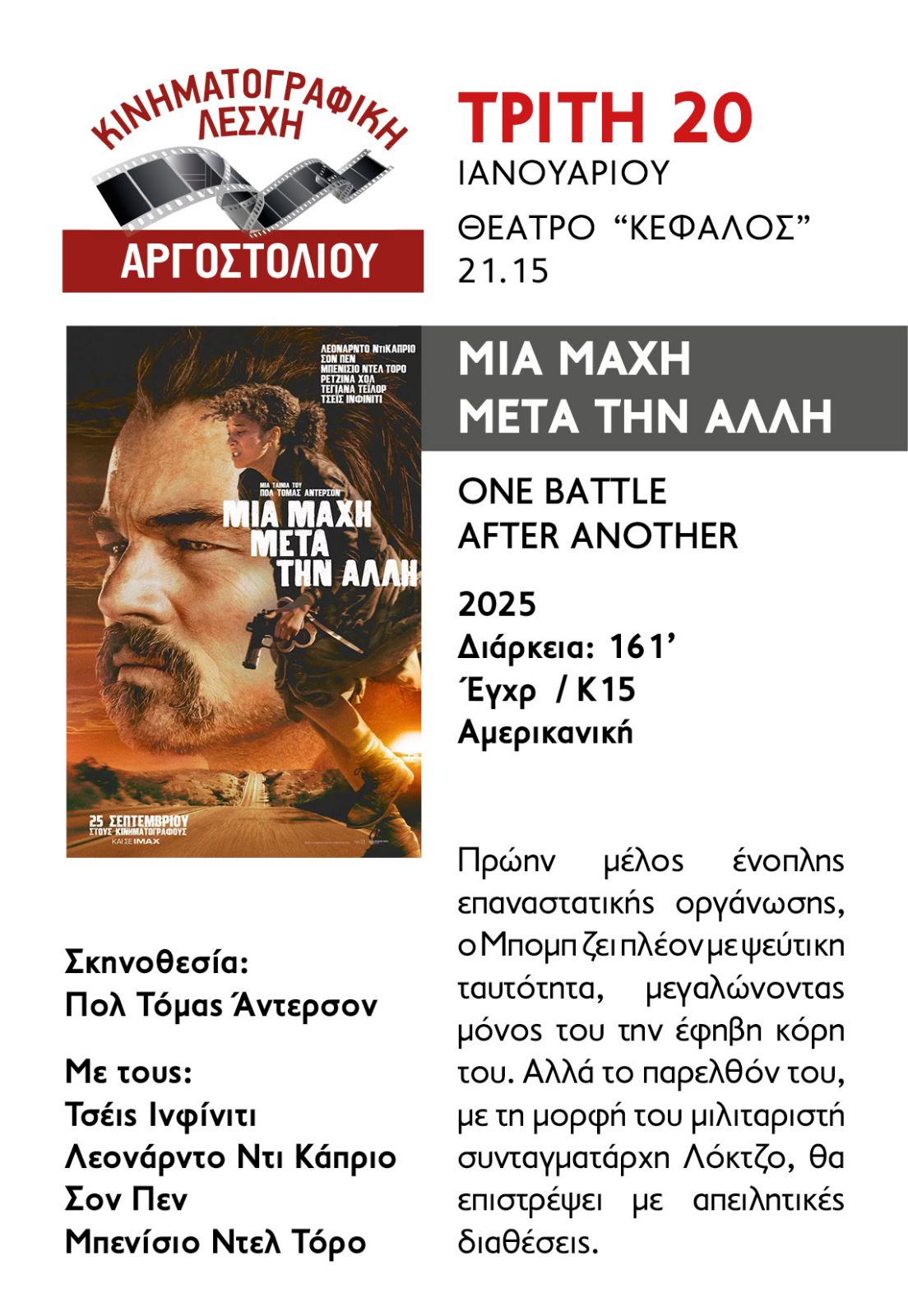 Η Κινηματογραφική Λέσχη Αργοστολίου προβάλλει την ταινία "Μία Μάχη Μετά την Άλλη" (One Battle After Another) την Τρίτη 20 Ιανουαρίου, στις 21:15, στο θέατρο "Κέφαλος".