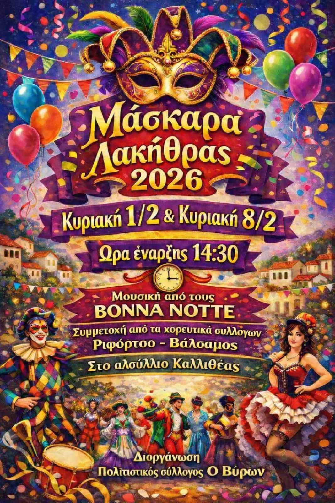 Ο Πολιτιστικός Σύλλογος «Ο Βύρων» προσκαλεί μικρούς και μεγάλους στη «Μάσκαρα Λακήθρας 2026», μια αποκριάτικη γιορτή που θα πραγματοποιηθεί την Κυριακή 1 Φεβρουαρίου και την Κυριακή 8 Φεβρουαρίου, με ώρα έναρξης τις 14:30, στο αλσύλλιο Καλλιθέας.