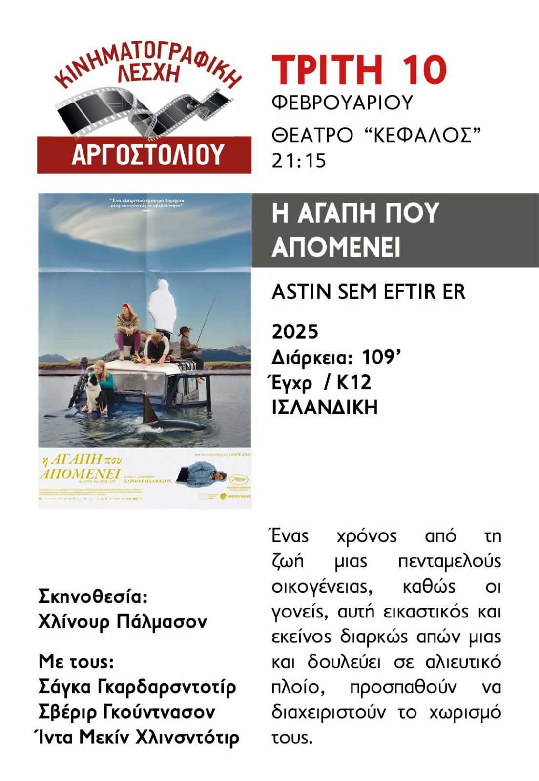 Η Κινηματογραφική Λέσχη Αργοστολίου παρουσιάζει την ταινία «Η αγάπη που απομένει» (Astin Sem Eftir Er) την Τρίτη 10 Φεβρουαρίου, στις 21:15, στο θέατρο «Κέφαλος».