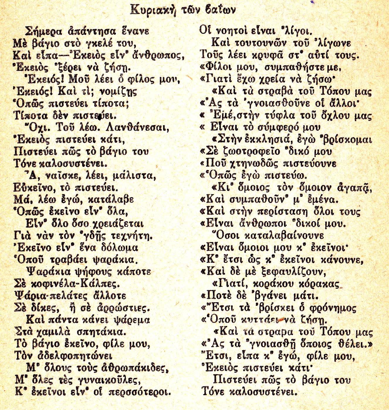 Σε αυτό το πλαίσιο εντάσσετε και το ποίημα «Κυριακή των Βαΐων» που στέκεται ψυχογράφημα ή καλύτερα μια αληθινή εικόνα που αφορά μέρος του κοινωνικού συνόλου. Εν ολίγοις θέλει να πει με το ποίημα του «Η Κυριακή των Βαΐων» ότι άλλον χαραχτήρα δείχνουμε, άλλον είμαστε, άλλα πράττουμε..., λειτουργούμε με άκρατο κακό συμφέρον και προσπαθούμε να συμπεριφερθούμε κατά πως μας θέλει η κοινωνία, ωραιοποιώντας τα πράγματα για να δείξουμε καλό εαυτόν.