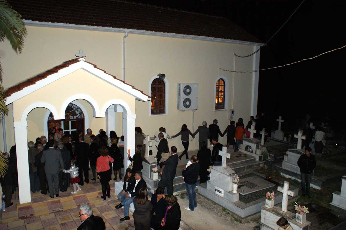 Αφού τελείωσε ο Εσπερινός με το διάβασμα του Ευαγγελίου στο ναό του Αγίου Αθανασίου, πραγματοποιήθηκε λιτανεία προς τον κοντινό ναό του Αγίου Σπυρίδωνος, που βρίσκεται σε απόσταση 150 μέτρων περίπου και στο δρόμο προς τον οικισμό. Φθάνοντας στον Άγιο Σπυρίδωνα διαβάστηκε το Ευαγγέλιο στο ναό, ακολούθησε η έξοδος του ιερέα, Σπύρου Τζαμαρία και των ψαλτάδων με την εικόνα της Αναστάσεως στον αύλειο χώρο της εκκλησιάς και έψαλλαν τη δέηση για τους αιώνια κοιμωμένους, όπως ορίζει το ορθόδοξο τυπικό για την ημέρα αυτή. Φυσικά, όλα αυτά μέσα από χαρούμενες κωδωνοκρουσίες και σμπάρα, που έριχναν μερικοί για το καλό της Αναστάσιμης χαράς του Χριστού μας..