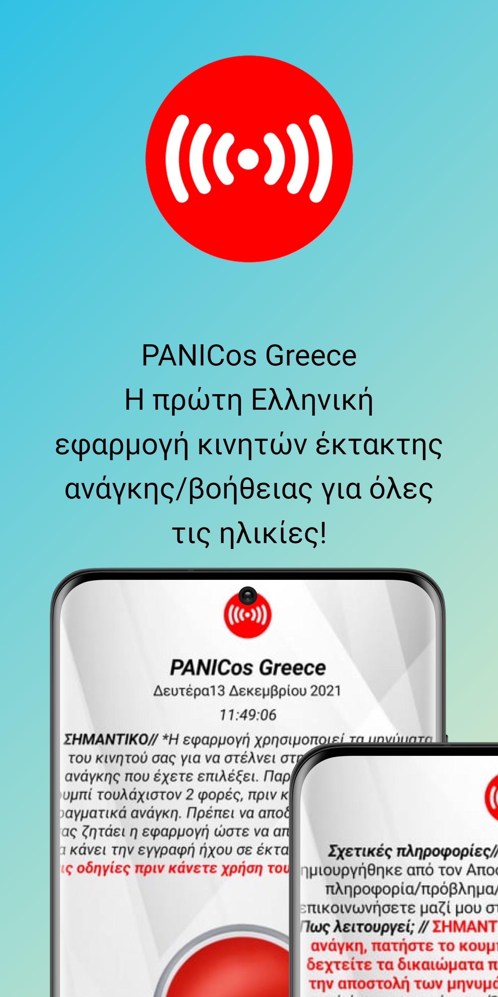 Σχετικές πληροφορίες & δήλωση δημιουργού εφαρμογής // Αυτήν η εφαρμογή-βοηθός δημιουργήθηκε από τον Αποστόλου Χρήστο. «Το 2021 διαδραματίστηκαν τρομερά γεγονότα βίας κατά των γυναικών και σημειώθηκαν δολοφονίες που συγκλόνισαν την ελληνική κοινωνία. Όλα τα συμβάντα που κατά καιρούς μαθαίνονται είτε ‘κρύβονται’ πίσω από πόρτες που δεν θα ανοίξουν ποτέ, περί κακοποίησης, βιασμών, ενδοοικογενειακής και ενδοσχολικής βίας, σεξουαλικών παρενοχλήσεων, αργοπορημένης νοσηλείας ανθρώπων που το έχουν πραγματικά ανάγκη κτλ., αποτέλεσε για εμένα έναυσμα να δημιουργήσω μια εφαρμογή που μπορεί να σώσει αμέτρητες ψυχές με το πάτημα ενός απλού κουμπιού. Ο χρόνος λένε ότι είναι ο καλύτερος δάσκαλος, δυστυχώς όμως πάντα σκοτώνει του μαθητές του. Οπότε η εφαρμογή PANICosGR ήρθε για να ειδοποιήσει τα άτομα που σας νοιάζονται όταν πραγματικά το έχετε ανάγκη. Η εφαρμογή μου αποτελεί ευκαιρία για την στήριξη των κακοποιημένων γυναικών, των γυναικών που δέχονται σεξουαλική παρενόχληση, των ανθρώπων που το έχουν πραγματικά ανάγκη και η ζωή τους κρέμεται σε μια κλωστή κάποιον λεπτών έως δευτερολέπτων. Σε τέτοιες στιγμές όλοι οι άνθρωποι που έχουν ανάγκη από βοήθεια πλημμυρίζονται από πανικό, από παράλυση ψυχική και σωματική, φωνές, ακόμα και συγγνώμες, αρκεί να τελειώσει ο εφιάλτης που κάποιος άλλος ή κάτι τους ασκεί. Μου φαίνεται αδιανόητο αυτό που συμβαίνει στην σήμερον εποχή. Αποτελεί δικαίωμα του καθενός, η ελευθερία και η ευτυχία, η οποία είναι άλλωστε το ζητούμενο της ζωής μας, που ο καθένας μας πρέπει να έχει. Βάλτε το PANICosGR στην ζωή σας, και πατήστε το με στόχο την ελπίδα. Σε ένα αμφιλεγόμενο μέλλον, ας δώσουμε ελπίδα στις ψυχές μας.»