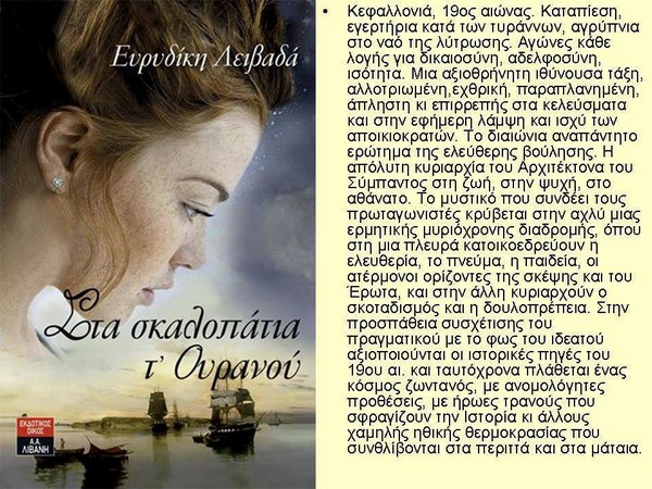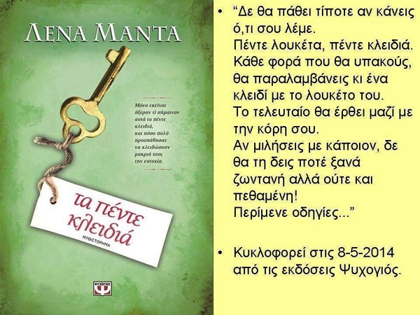 Μερικά λοιπόν απ’ τα προτεινόμενα και πολύ ενδιαφέροντα βιβλία είναι «Στα σκαλοπάτια τ’ ουρανού» της Ευριδικής Λειβαδά, η «Ογκρέσα» του Κώστα Κρομμύδα, «Το κελάρι της ντροπής» της Χρησηίδας Δημουλίδου, η «Μοιχεία» του Paulo Coelho, «Τα πέντε κλειδιά» της Λένας Μαντά, «Η Μηδεία δεν χόρεψε ποτέ» της Πασχαλίας Τραυλού και οι «Ψίθυροι στις Φλόγες» της Ευγενίας Ευσταθίου.